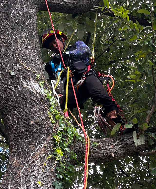樹伐採センターではクレーンやレッカーが侵入できない場所に生えている高木や倒木でも、特殊伐採可能です。クレーンやレッカーを使わず、ロープを使って高木や巨木に登って伐採する「ロープワーク」の高い技術があるため、狭い敷地内でも安全に伐採いたします。