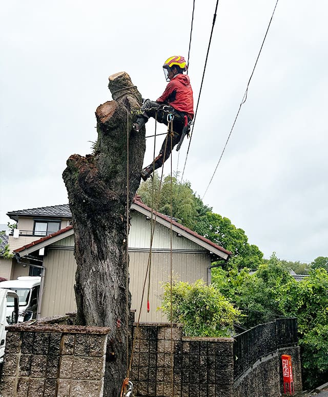 ロープワークや安全対策を駆使しながら、木に登り、上から枝や幹を順番に切り落としていく技術は、まさに職人技。伐採センターでは、こうした空師による「特殊伐採」にも対応しています。