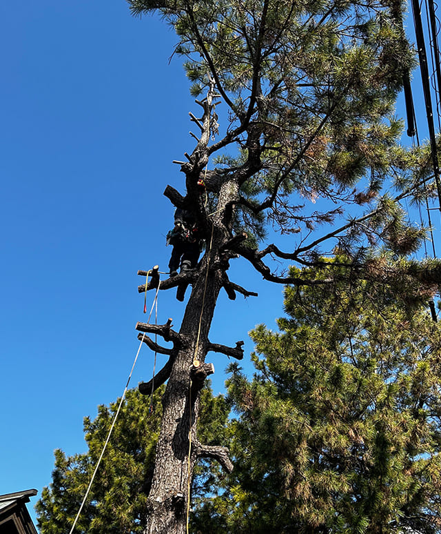 境内の松、楠木の伐採バス停がある為にクレーンの設置が難しく、ロープワークで全ての枝と幹を敷地内に安全に降ろします